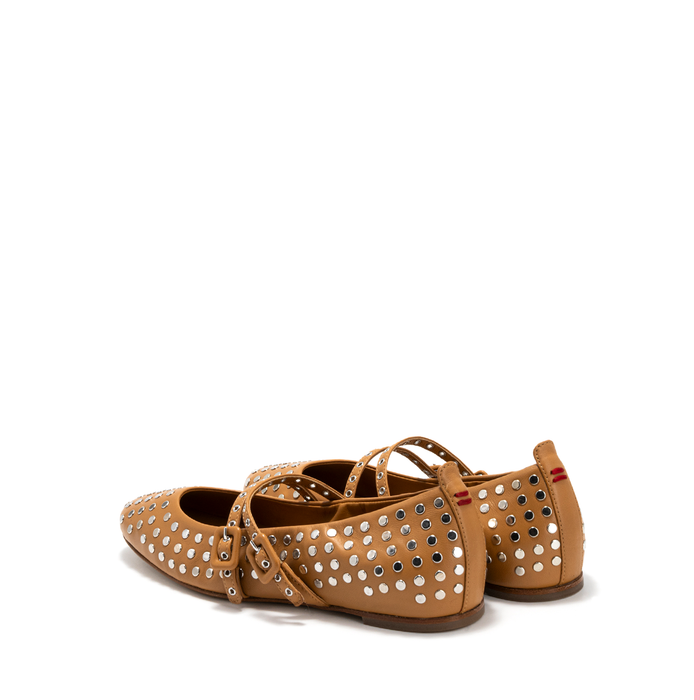 Caramel brown leather loafers from Halmanera. An almond-toe, slip-on design, buckle closure. Stud-embellished. Leather lining. Leather sole with anti-slipper rubber injection.