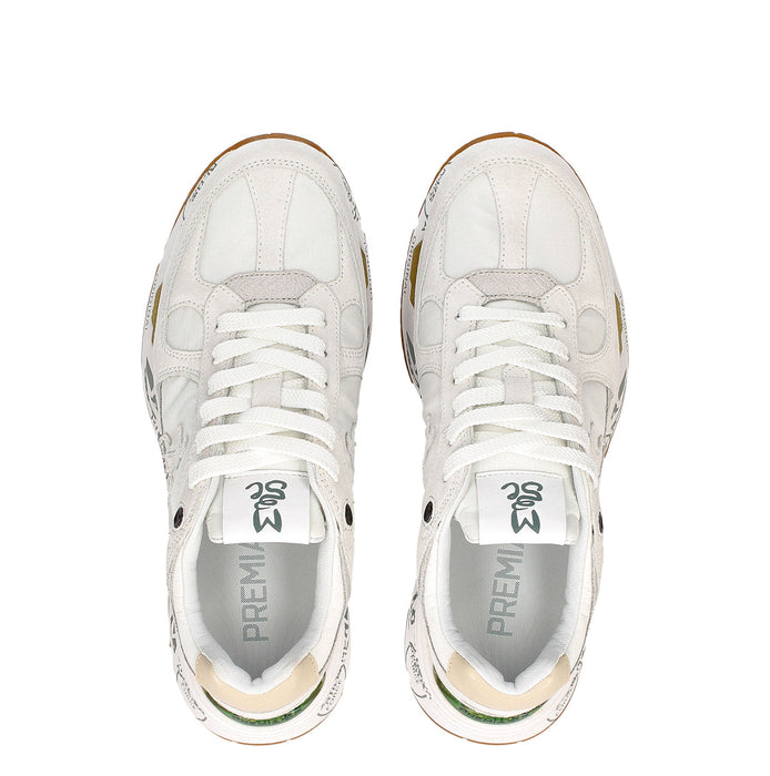 Suede and technical nylon sneakers in white from Premiata. A round toe, lace-up closure. Partially finished in a signature worn look. Dual-density rubber outsole. Logo print at the front. Patented design model.