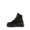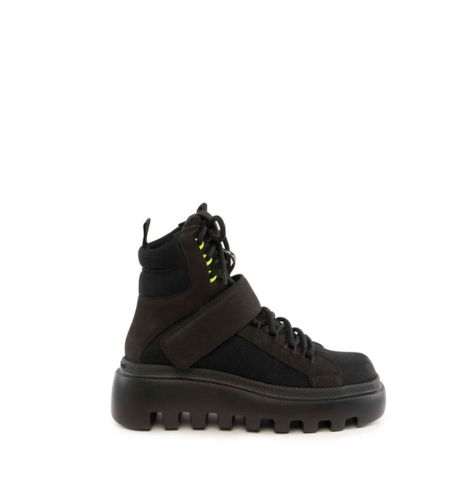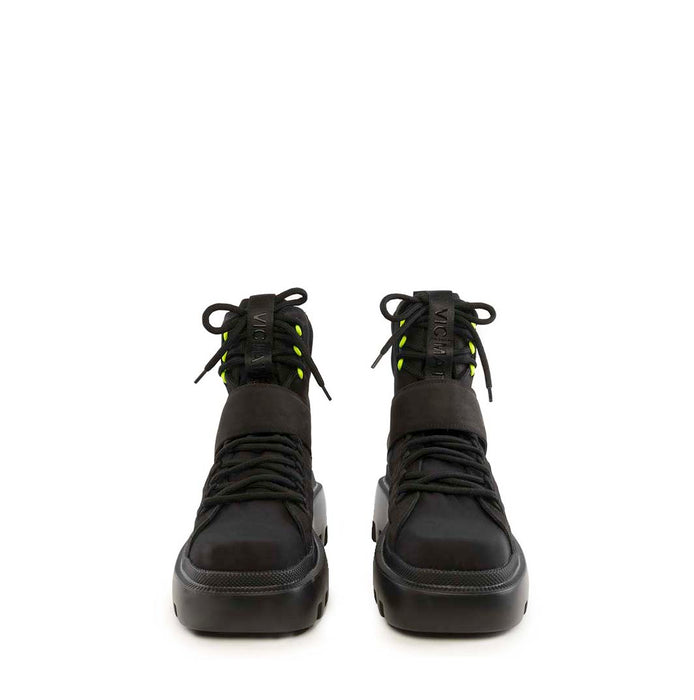 Ankle-high boots from Vic Matie. A curved form toe, lace-up, and Velcro stamp closure. Partly jagged lightweight rubber sole. Leather lining.