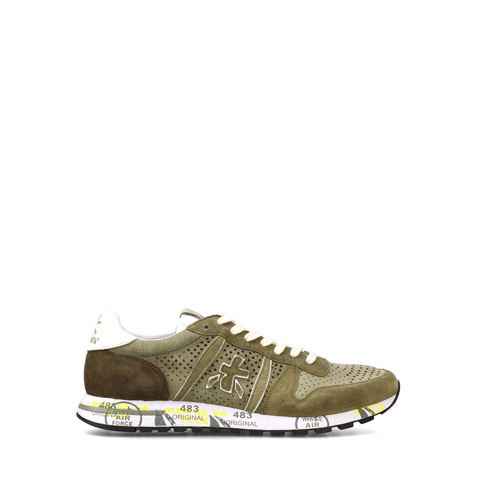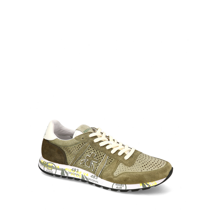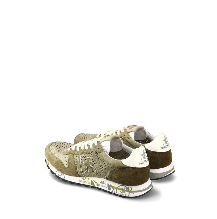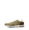 Perforated washed effect suede sneakers in khaki tones from Premiata. A round toe, lace-up closure. Dual-density rubber outsole. Patented design model.