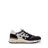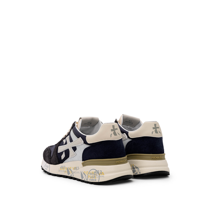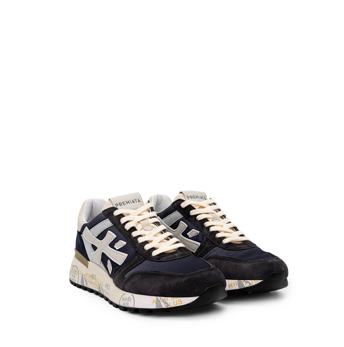 Leather and technical textile sneakers in navy with white details from Premiata. A round toe, lace-up closure. Stamped graphic print details. Leather finished in washed effect. Logo print dual-density rubber outsole. Leather lining. Patented model.