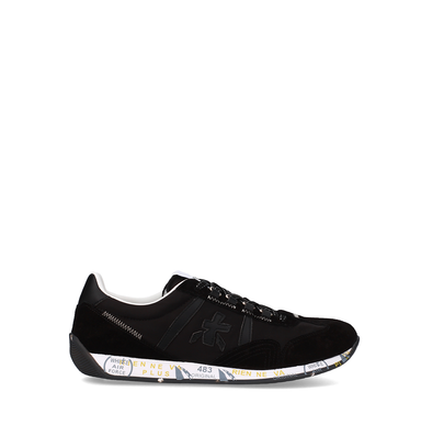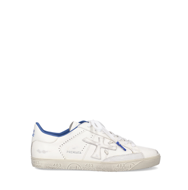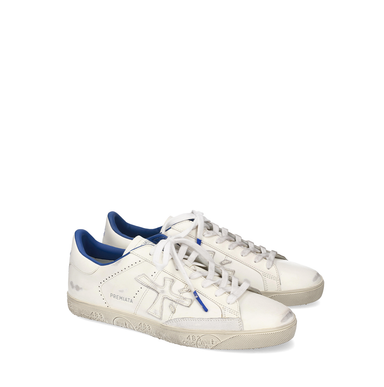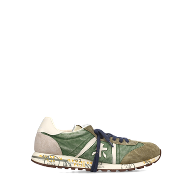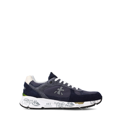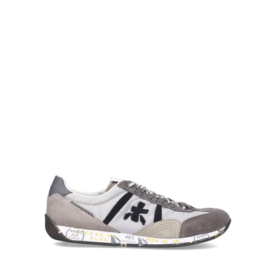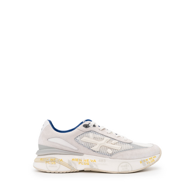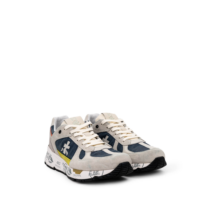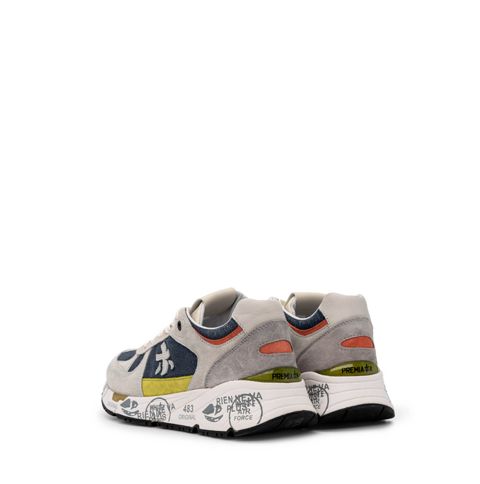 Leather and technical nylon sneakers in grey with blue, green and orange details from Premiata. A round toe, lace-up closure. Leather finished in washed effect. Logo print dual-density rubber outsole. Leather lining. Patented model.