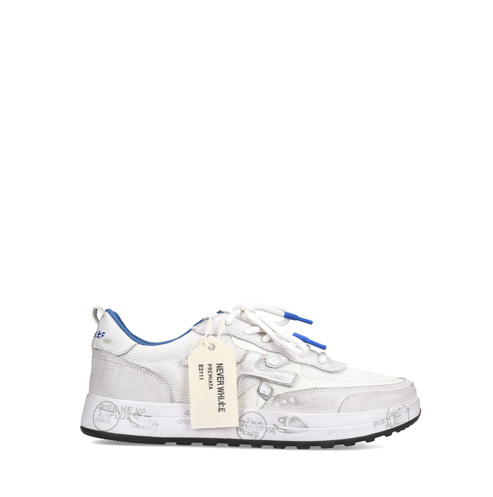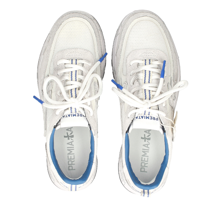 White suede and mesh textile sneakers from Premiata. A round toe, lace-up closure. Partially finished in a signature-worn look, making each pair different and exclusive. Leather lining. Rubber sole. Patented design model.
