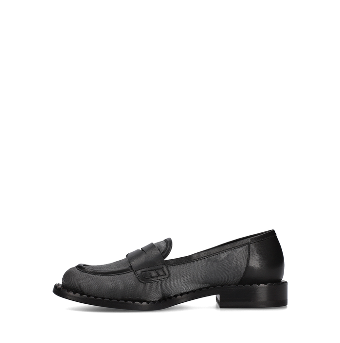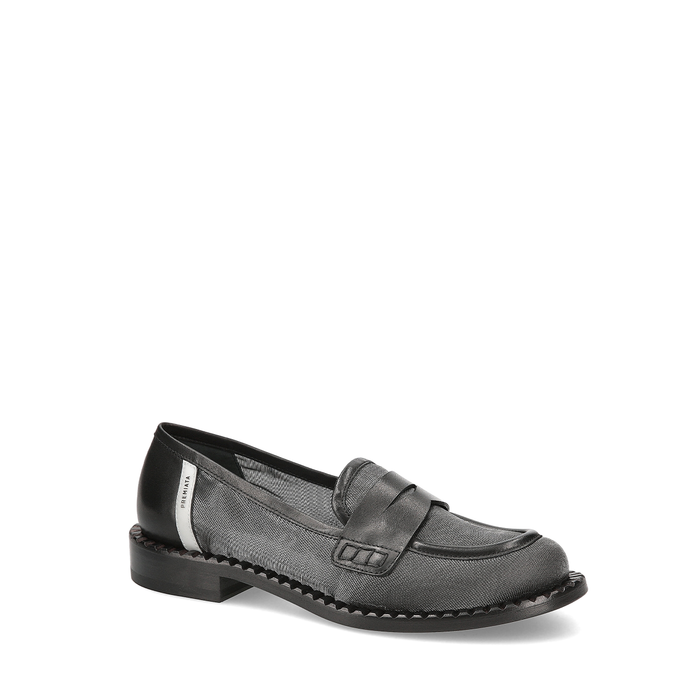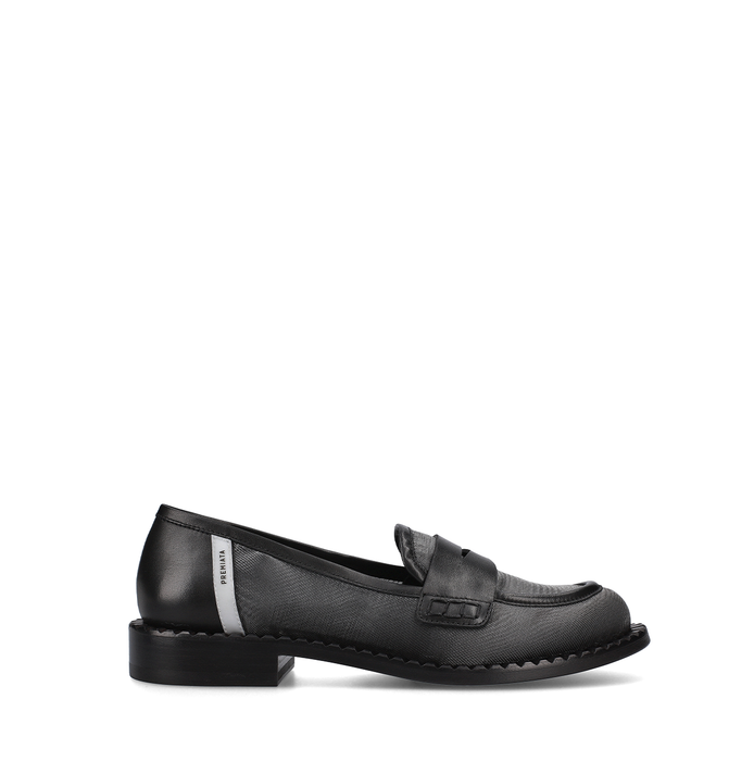Leather loafers in black from Premiata. Reimagined in mesh, which lightens its volume and softness. A round-toe, slip-on design. Rubberized logo detail. Leather lining. Leather/rubber sole. The mix of intense research and high-tech design with the classic and traditional methods.