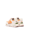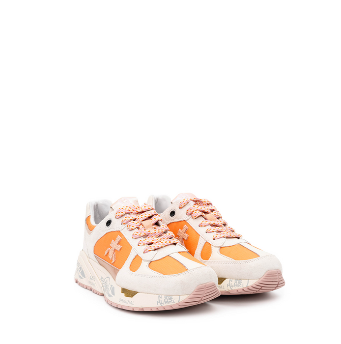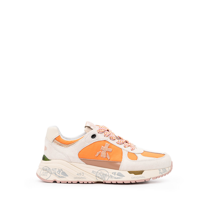 Leather and technical nylon sneakers in beige with coral tone details from Premiata. A round toe, lace-up closure. Partially finished in a signature worn look. Dual-density rubber outsole. Logo print at the front. Patented design model.