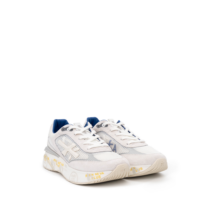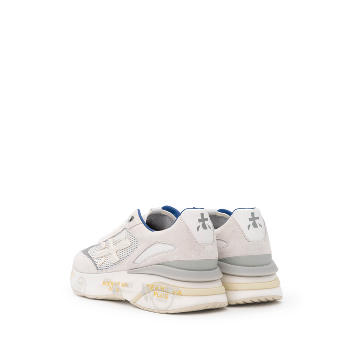 Leather and mesh textile sneakers in white from Premiata. A round toe, lace-up closure. Logo is on the external side, and PREMIATA is written on the internal side. Leather lining. Rubber sole. Patented design model.