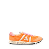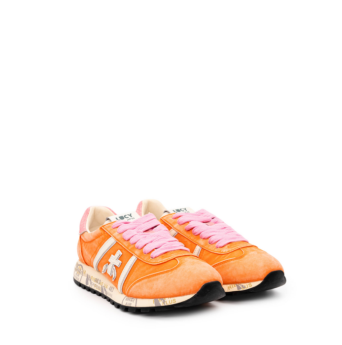 Leather and textile sneakers in orange tone from Premiata. A round sneakers toe, lace-up closure. These sneakers are finished with a unique washing technique, making each pair unique and exclusive. Leather inner sole. Dual-density rubber outsole. Logo print is on the sole, patented design model.