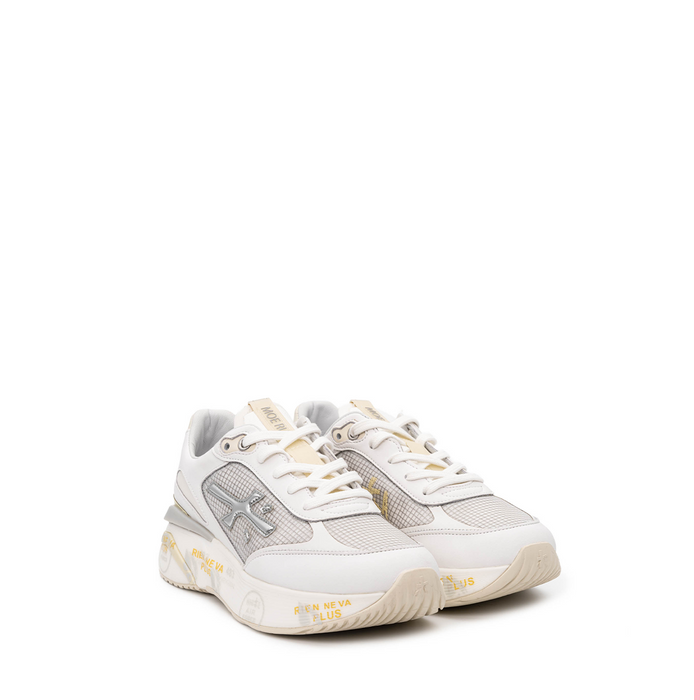 Leather and textile sneakers in white with grey and silver details from Premiata. A round sneakers toe, lace-up closure. Leather inner sole. Dual-density rubber outsole. Logo on the external side, PREMIATA writing on the internal side, model print at the sole, patented design model.