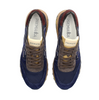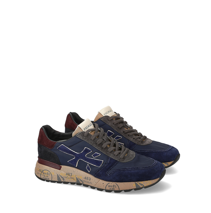 Leather and technical textile sneakers in navy with burgundy details from Premiata. A round toe, lace-up closure. Decorative stitching. Dual-density rubber outsole. Patented design model.
