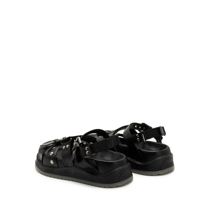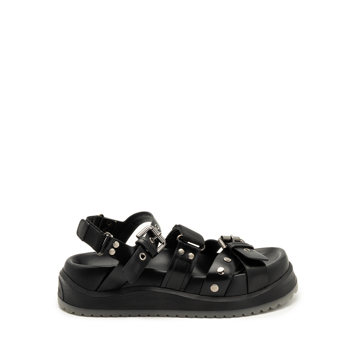 Leather sandals in black tone from Premiata. A round-toe, slip-on design, buckle and Velcro closures. Decorated with metallic studs. Leather lining, anatomical insole. Rubber sole. The mix of intense research and high-tech design with the classic and traditional methods.