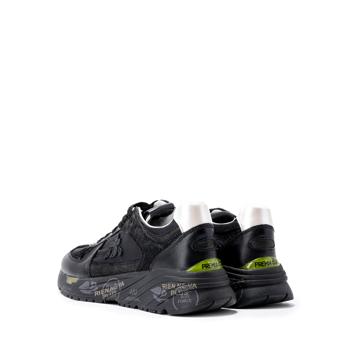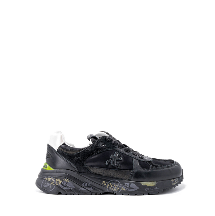 Leather and technical textile sneakers in black from Premiata. A round toe, lace-up closure. Fur details. Dual-density rubber outsole. Patented design model.