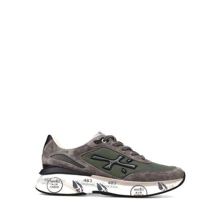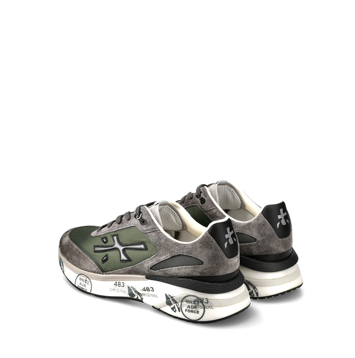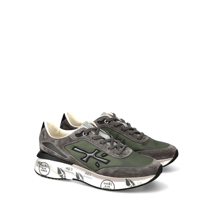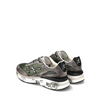 Lightweight technical nylon and suede sneakers in dark grey with green detail from Premiata. A round sneakers toe, lace-up closure. Leather lining. Dual-density rubber outsole. Logo print at the sole, patented design model.