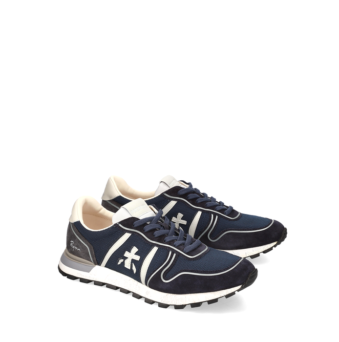 Suede and woven textile sneakers in navy from Premiata. A round sneakers toe, lace-up closure. Leather lining. Rubber sole. Logo print, patented design model.