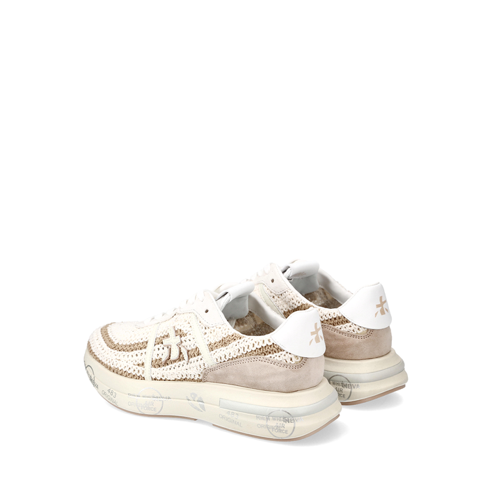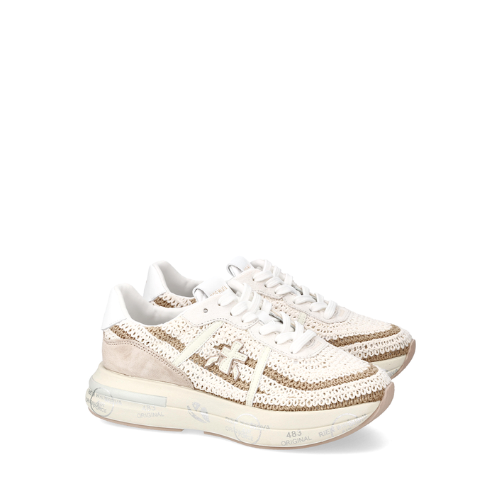 Woven textile and suede sneakers in white and beige tones from Premiata. A round toe, lace-up closure. Logo print on the rubber sole. Leather lining. Rubber sole. Patented design model.