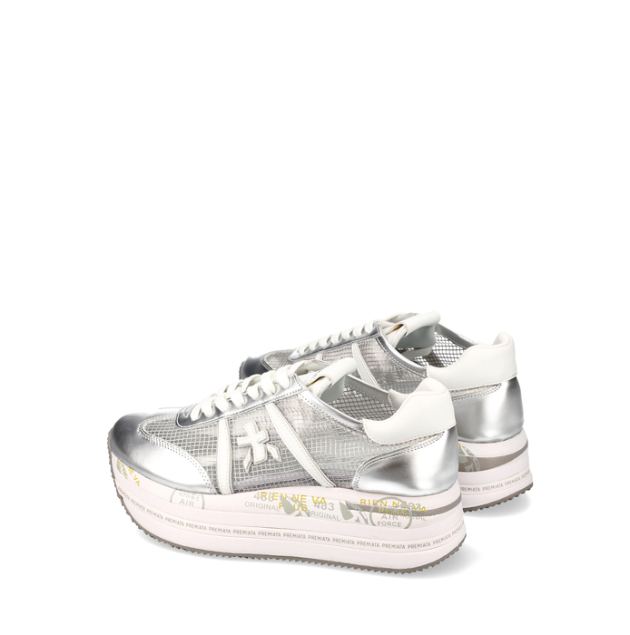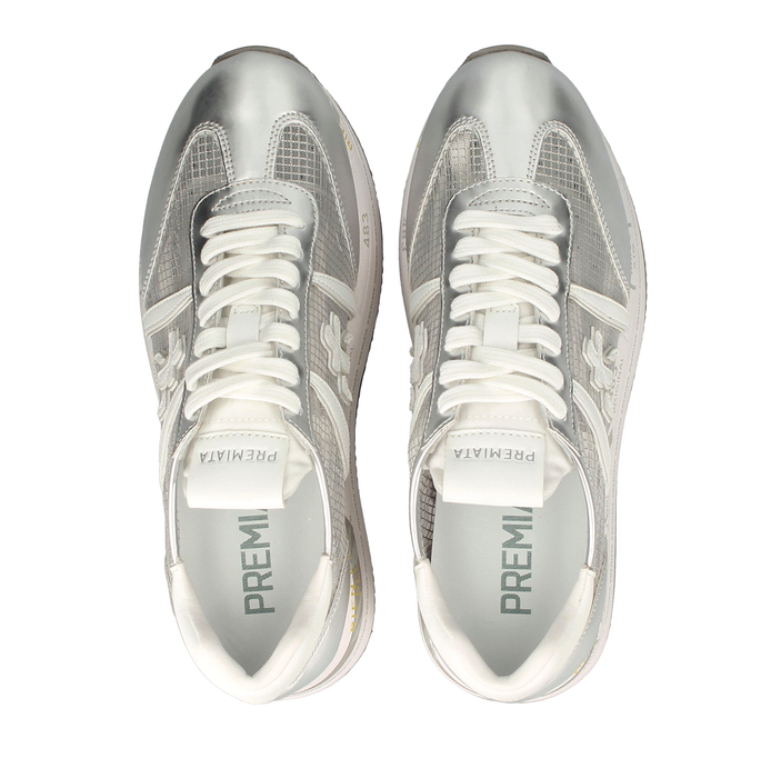 Leather and mesh textile sneakers in grey with metallic effect leather detail from Premiata. A round sneakers toe, lace-up closure. Leather/textile lining. Rubber sole. Logo print, patented design model.