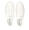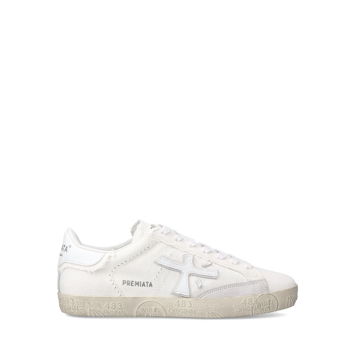 Suede and technical textile sneakers in white tone from Premiata. A round toe, lace-up closure. Leather lining. The signature worn looks rubber sole. Patented design model.