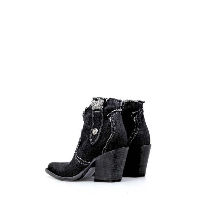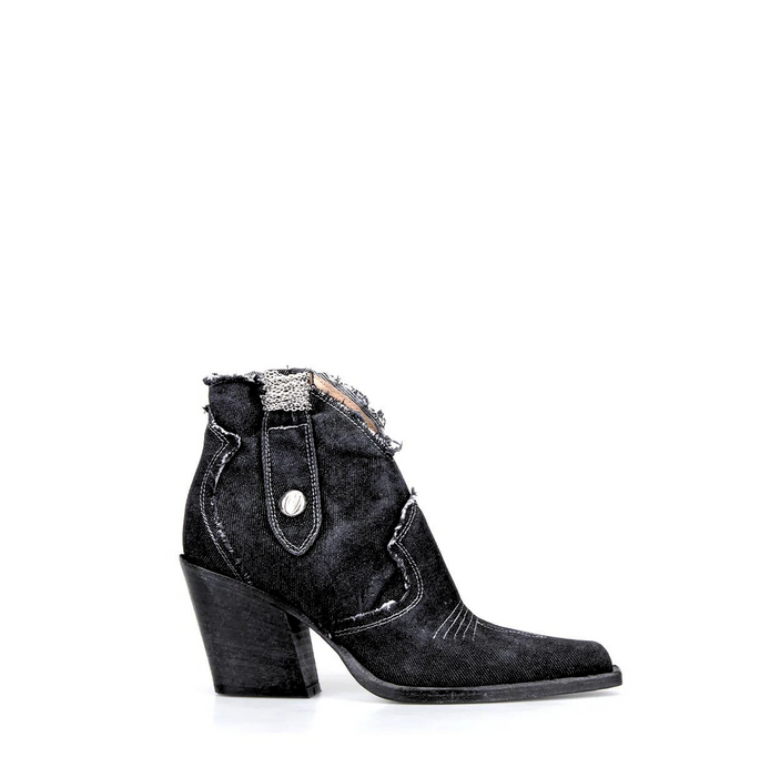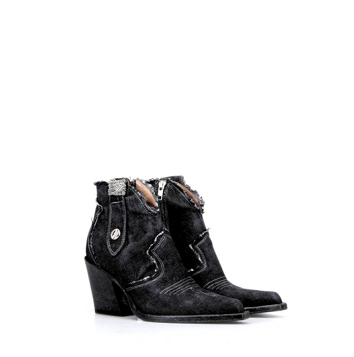 Western-style ankle-high boots in dark denim from Fruit. A pointy toe, slip-on design, zip closure. Raw cut denim, decorative details. Signature worn look denim and leather sole. Please note that these leather shoes are finished with a unique washing technique making each pair different and exclusive.