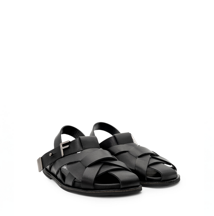 Leather gladiator sandals in black from Fruit. A round-toe, buckle closure. Leather lining. Leather/rubber sole.