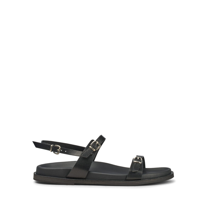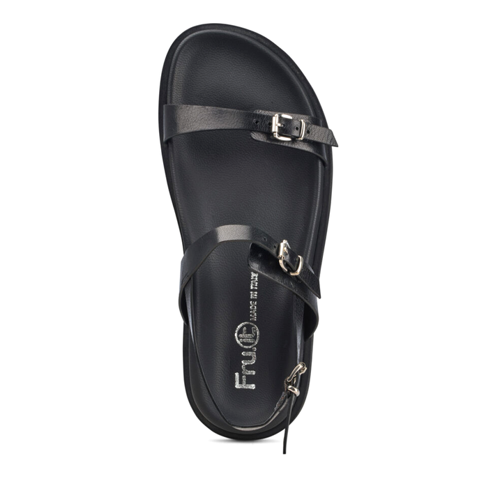Black leather sandals from Fruit. A round-toe, slip-on design, buckle closure. Leather lining. Leather/rubber sole.