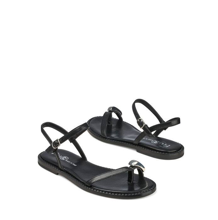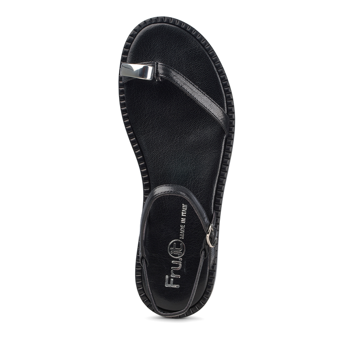 Black leather sandals from Fruit. A round-toe, slip-on design, buckle closure. Decorative embellishment. Leather lining. Leather sole.