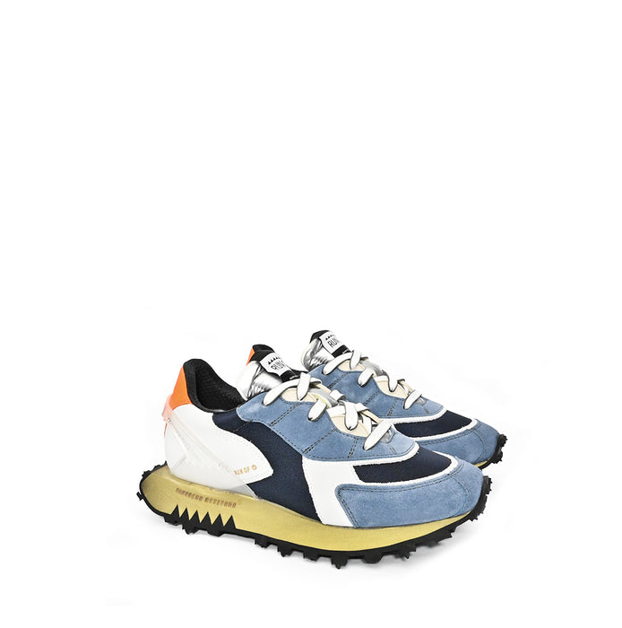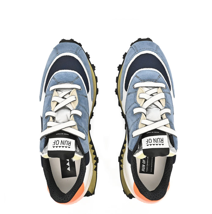 Eclectic design sneakers from Run Of. A round sneakers toe, lace-up closure. A mix of suede, leather, and mesh textile. Fuss-bet in memory gel. Vintage-style tongue in nylon and foam. Back rubber support in micro-injection. Patented design Run Of sole with 3D design. Lightweight and flexible. Leather/ textile lining.
