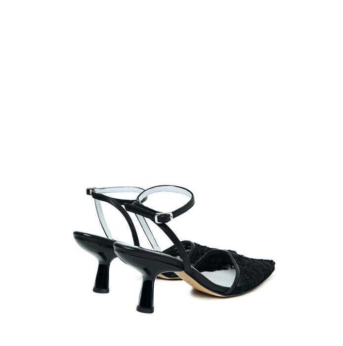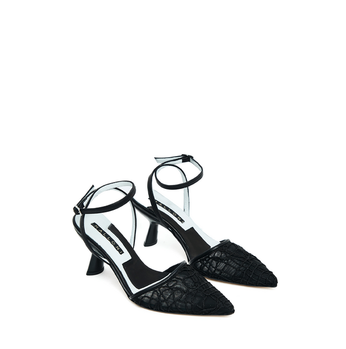 A slingback leather pumps in black from Malloni. Embroidery on the front, created with various twisted threads for an irregular three-dimensional net effect. A curved toe, buckle closure. Leather lining. Spool heel, leather sole.