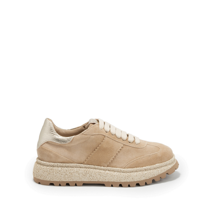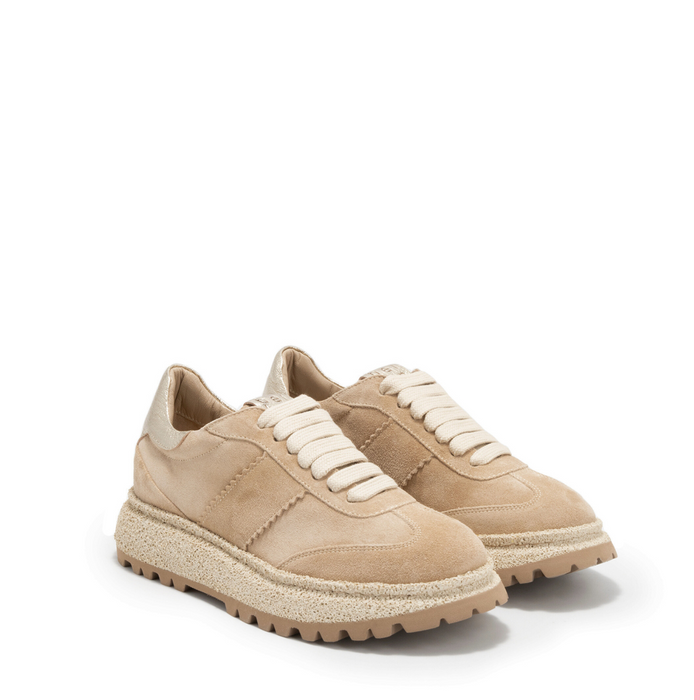 Suede sneakers in dark nude tone with laminated golden leather detail from Laura Bellariva. A round-toe, lace-up closure. Leather lining. Rubber sole.